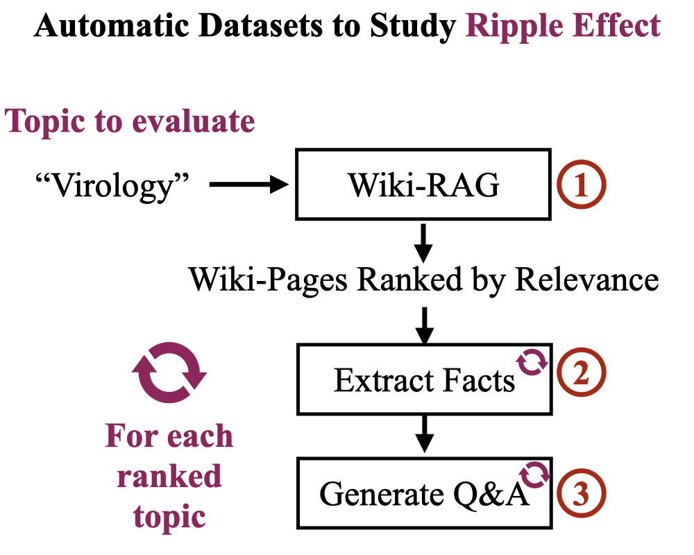 Knowledge editing in LLMs have unintended ripple effects on nearby concepts. Measuring this requires building a custom dataset - challenging!. We propose RippleBench - our RAG-LLM pipeline can automatically generate structured datasets given a concept ("biology").